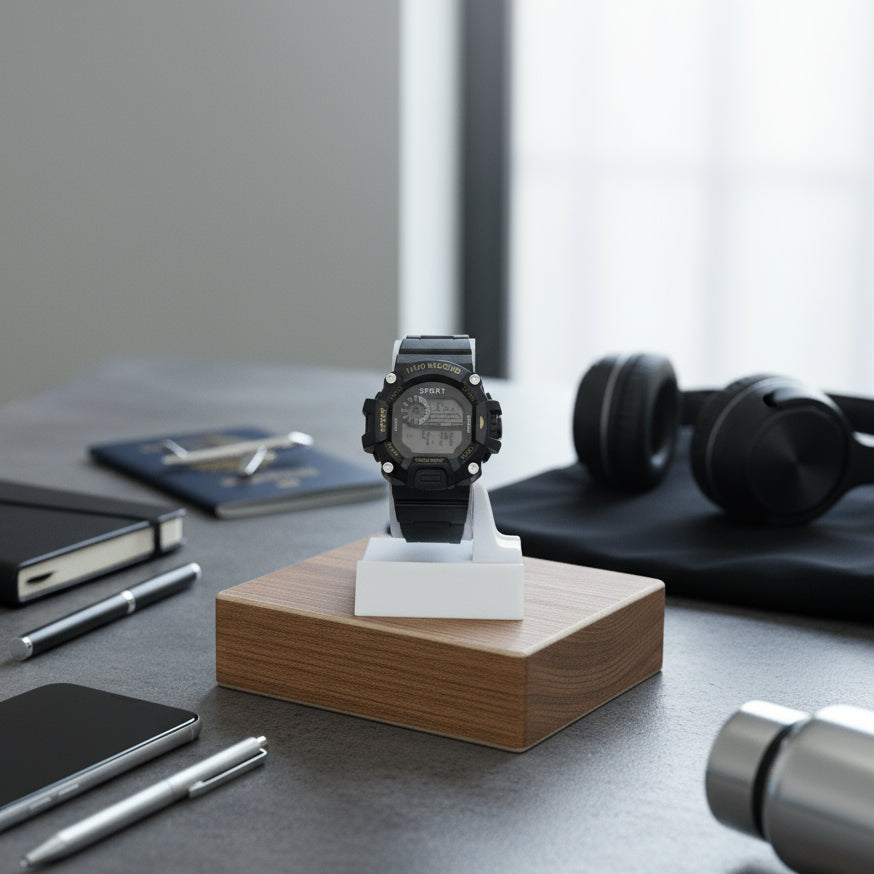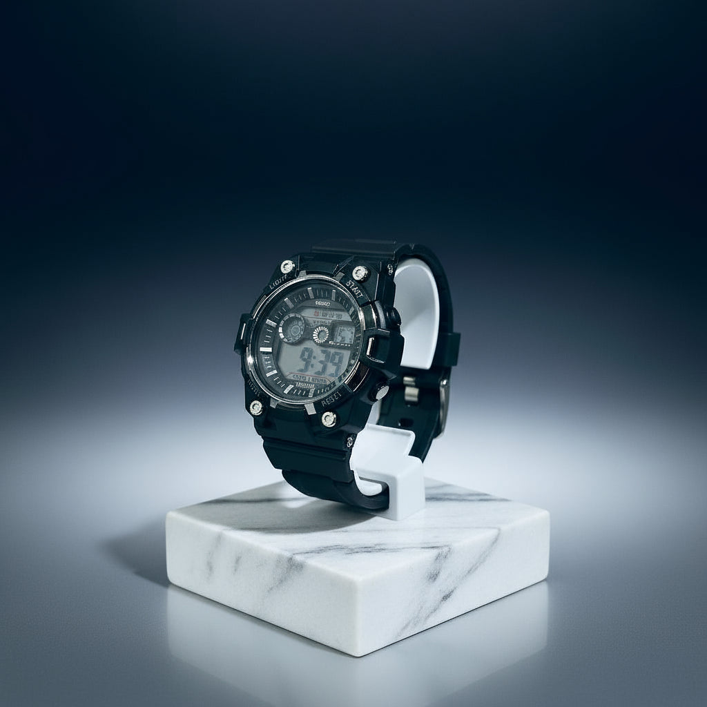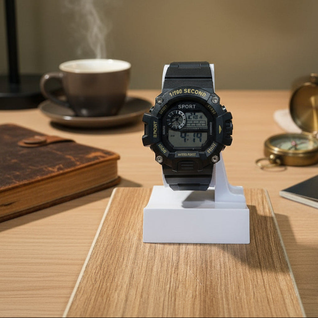 تجمع هذه الساعة الرياضية الرجالية بين الأناقة والمتانة اليومية. تبقيك الشاشة الرقمية على المسار الصحيح مع الوقت والتاريخ والوظائف الأساسية في لمحة. تم تصميمه بشكل متين ليناسب أنماط الحياة النشطة، ويتميز بحزام موثوق وبنية مقاومة للماء. مثالي للتمرينات أو الملابس الكاجوال أو المغامرات اليومية. ساعة عملية لا تتنازل عن مظهرها.