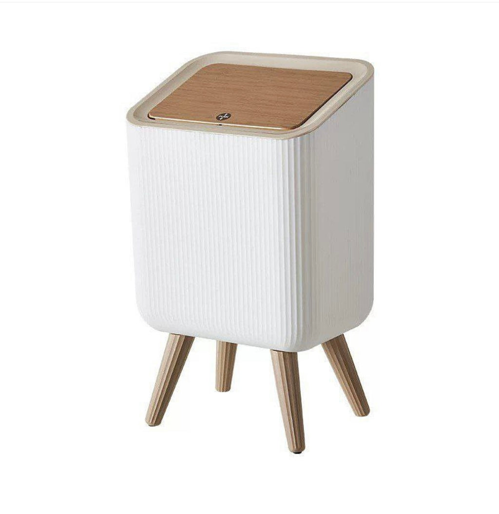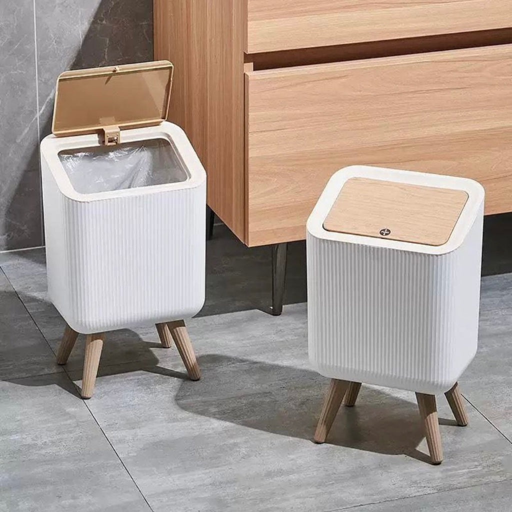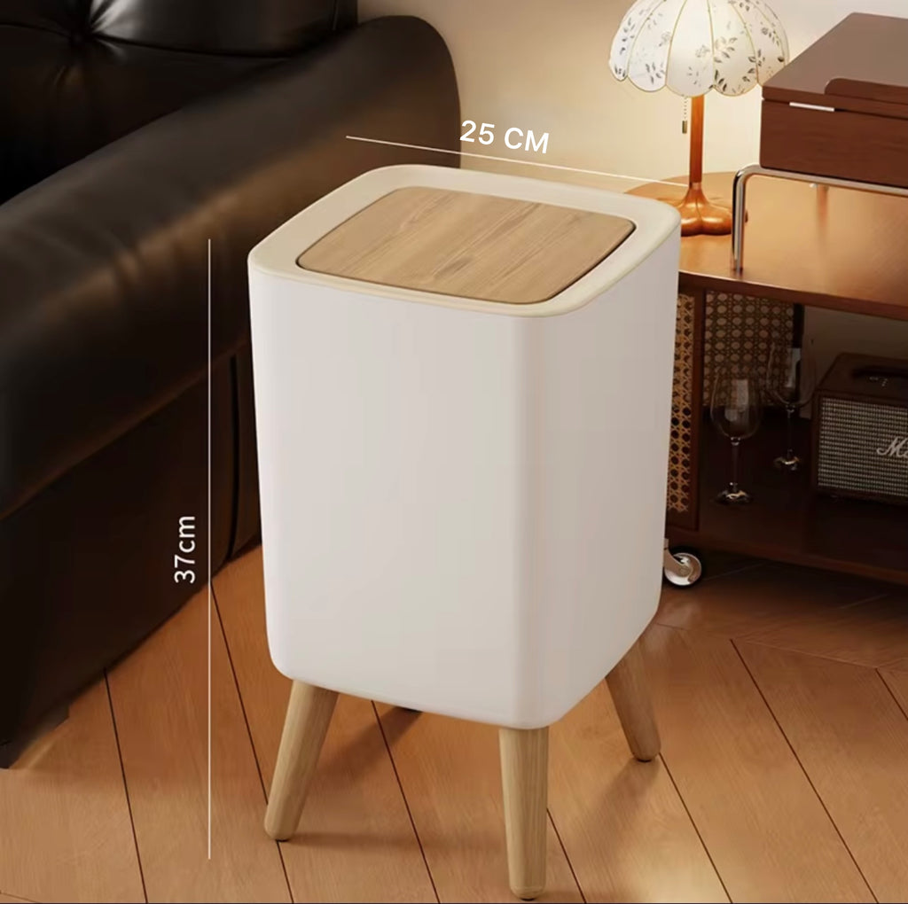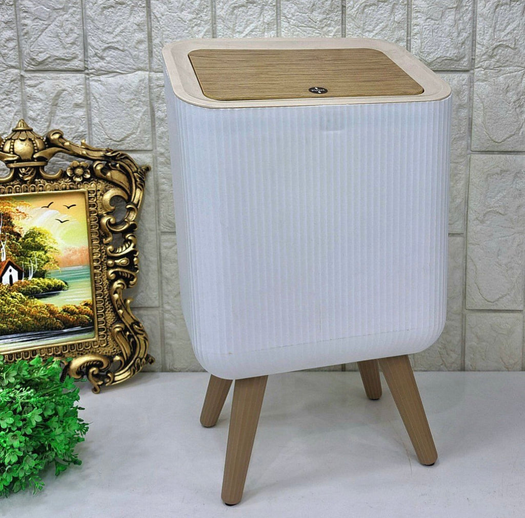تتميز سلة المهملات الحديثة ذات القدم العالية بتصميم مربع بلاستيكي متين مع غطاء مريح من النوع المضغوط، مثالية لغرفة المعيشة أو الحمام أو المطبخ. يضيف طرازه الفاخر باللونين البيج والأبيض لمسة أنيقة إلى ديكور منزلك. توفر الأرجل الخشبية دعمًا ثابتًا، مما يجعلها عملية وأنيقة للتخلص من النفايات اليومية.