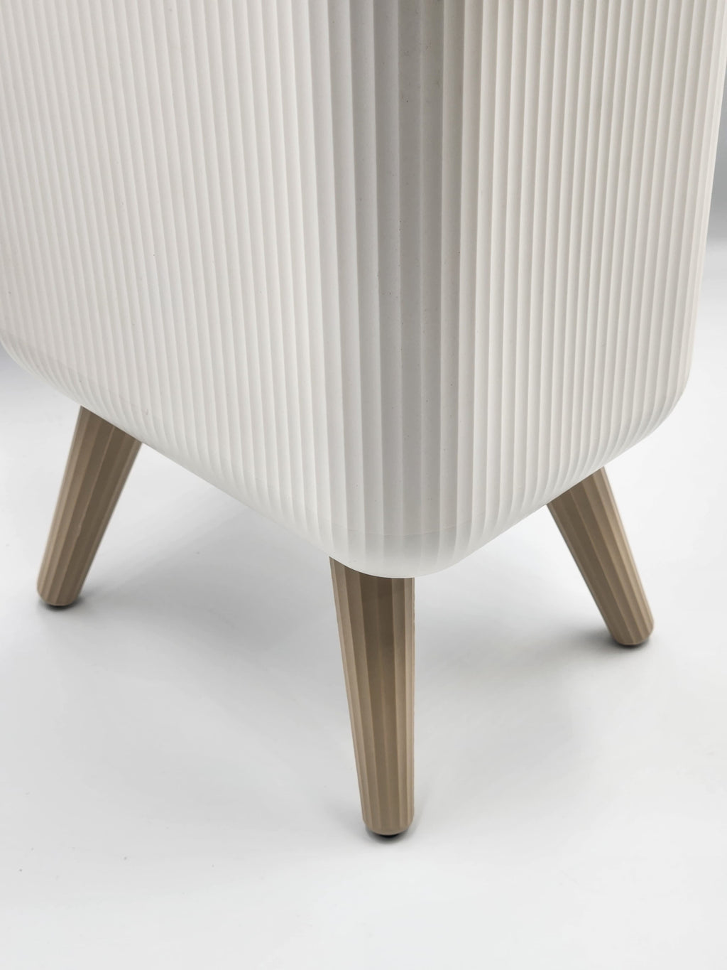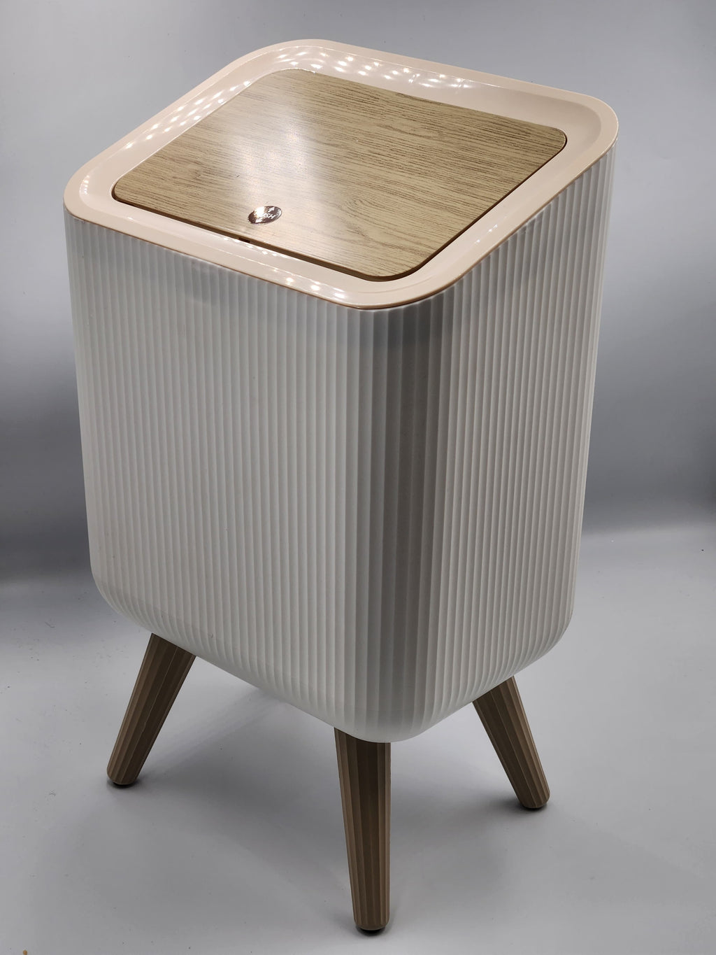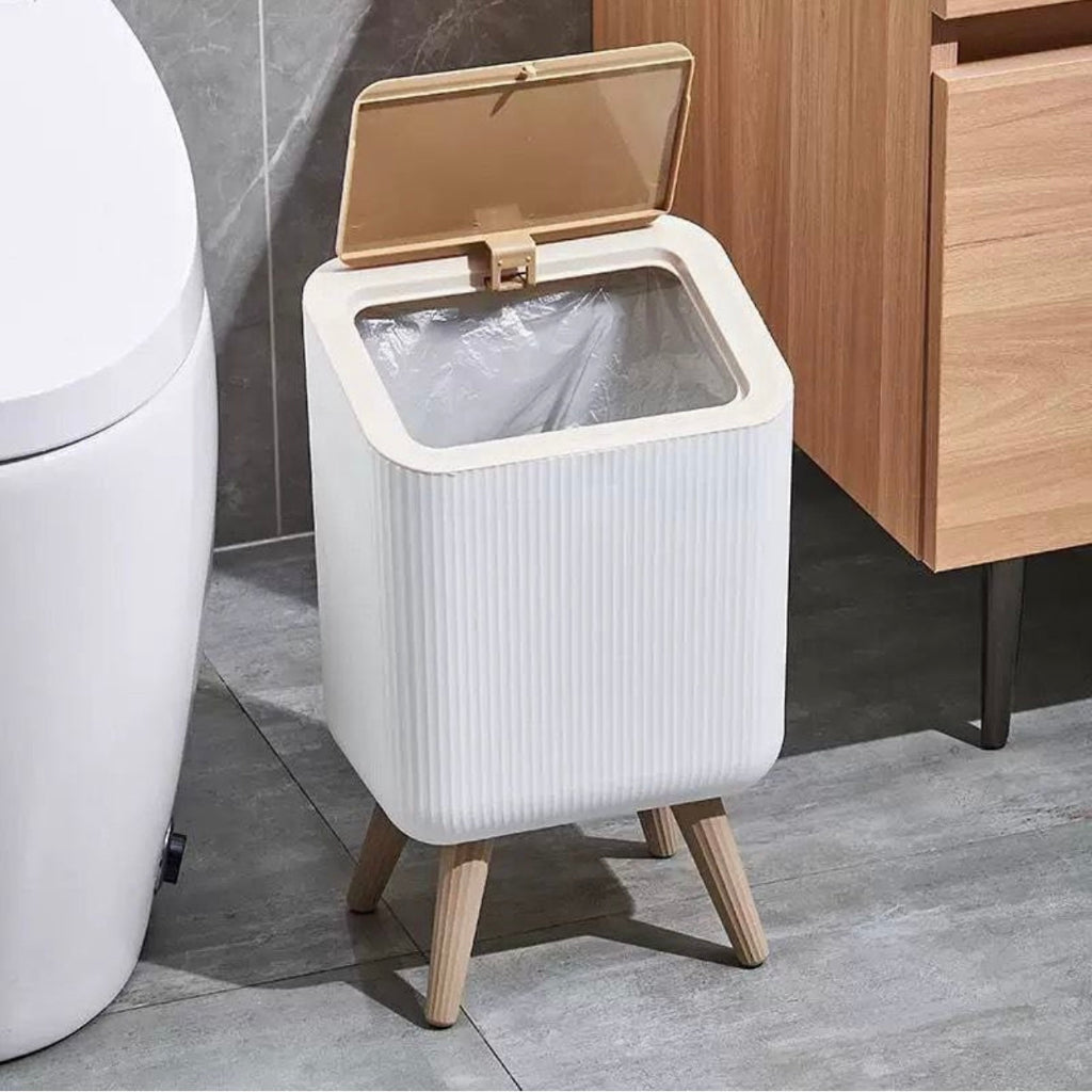 تتميز سلة المهملات الحديثة ذات القدم العالية بتصميم مربع بلاستيكي متين مع غطاء مريح من النوع المضغوط، مثالية لغرفة المعيشة أو الحمام أو المطبخ. يضيف طرازه الفاخر باللونين البيج والأبيض لمسة أنيقة إلى ديكور منزلك. توفر الأرجل الخشبية دعمًا ثابتًا، مما يجعلها عملية وأنيقة للتخلص من النفايات اليومية.