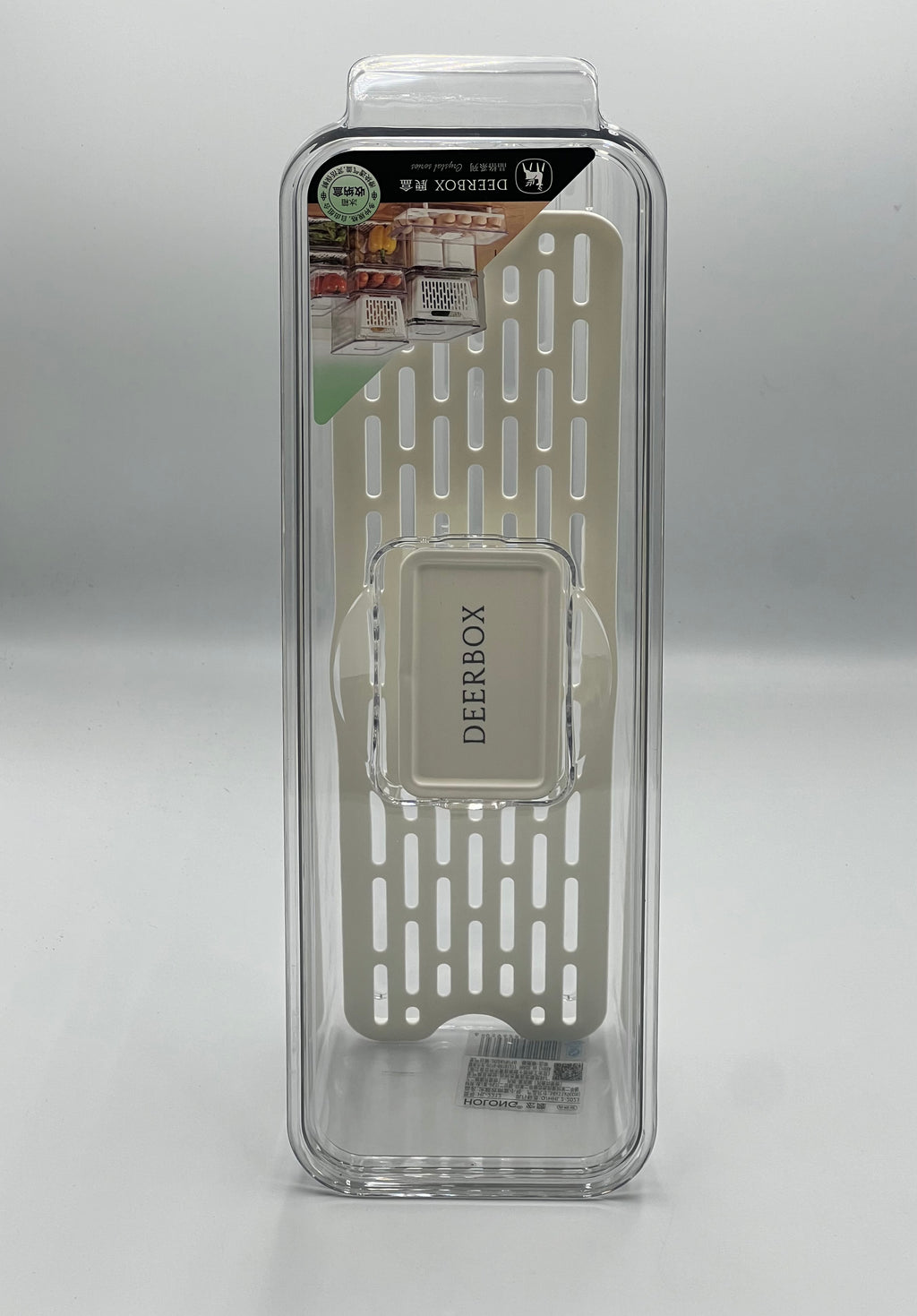 This acrylic rectangular food storage box features a tightly sealed plastic lid to keep your food fresh. It includes a drainage plate for added convenience and is made from high-quality materials, ensuring durability. Its transparent white design makes it practical and easy to use in any kitchen.