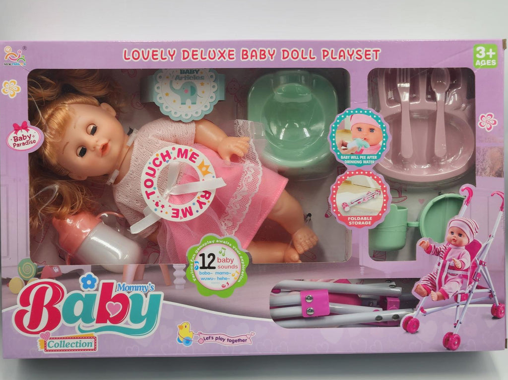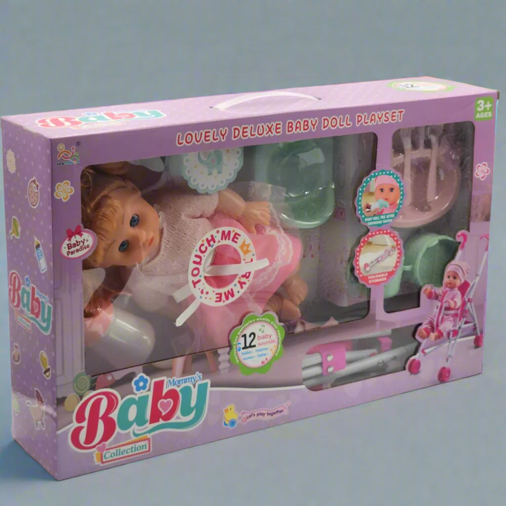 This Lovely Deluxe Baby Doll Playset includes a charming baby doll, a stroller, and fun accessories. Designed for kids, it encourages imaginative play and helps develop nurturing skills. Perfect for hours of creative fun and role-playing adventures.