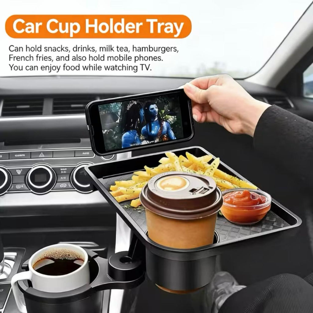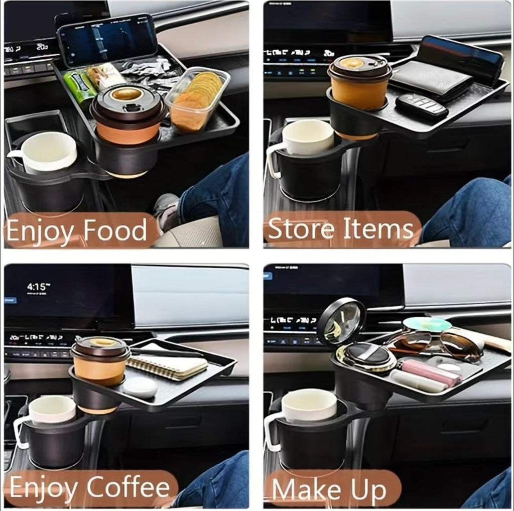 Features a detachable, adjustable base with 360° rotation for flexible positioning. Includes dual cup holders and non-slip rubber pads to keep items stable and prevent direct food contact. Designed for convenience during daily commutes and long-distance road trips. Easy to install and suitable for most car cup holders.
