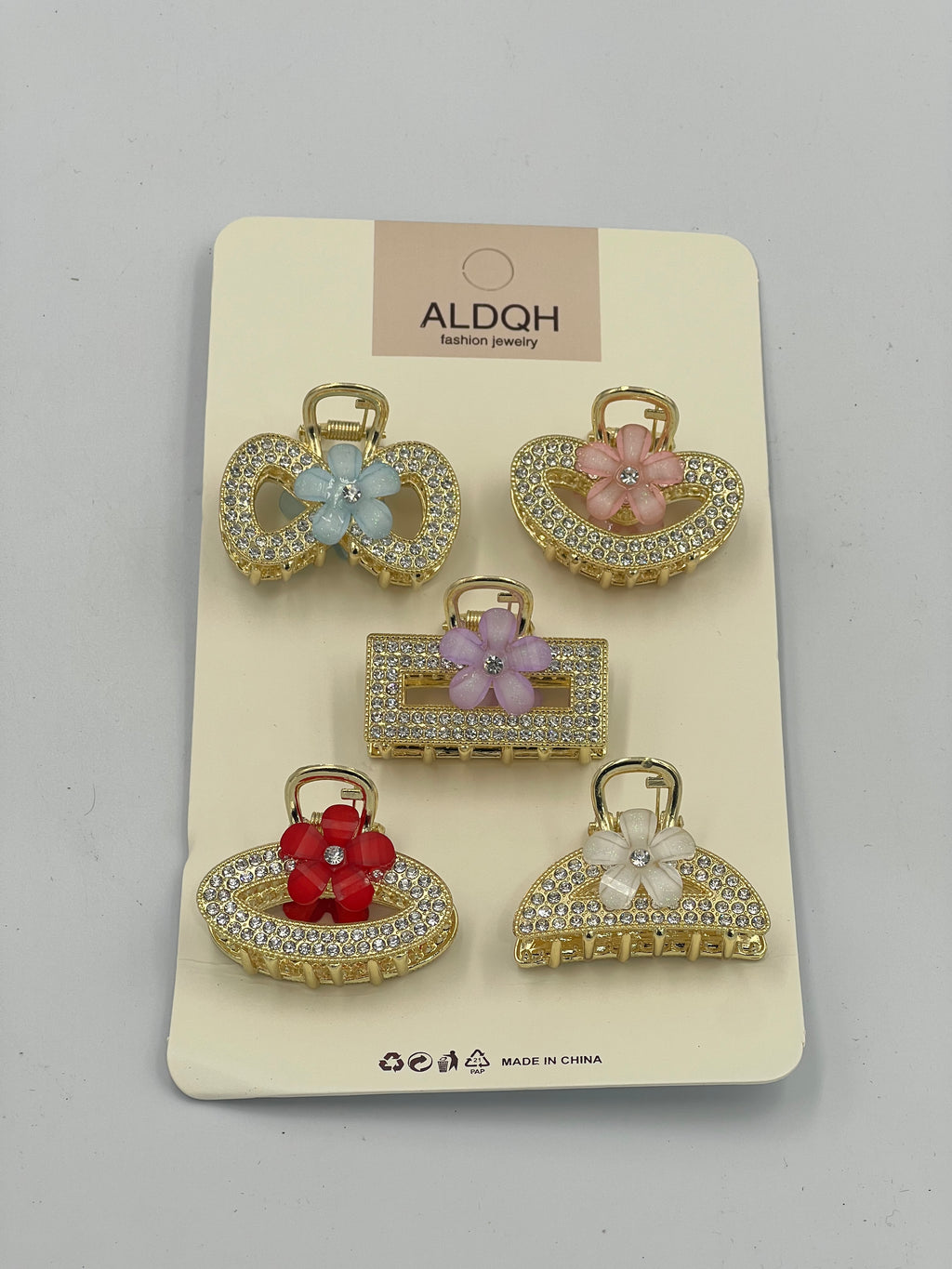 This set of five golden-tone alloy hair clips features charming heart and infinity symbol designs adorned with sparkling crystals. Each clip offers a secure, non-slip grip, making them perfect for everyday wear or special occasions. These cute and elegant accessories add a touch of shine and style to any hairstyle.