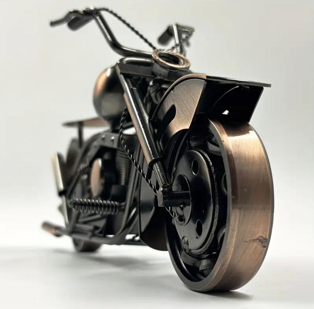This handmade retro iron motorcycle model is a charming vintage metal craft ornament. Its detailed design and sturdy iron construction make it a unique decoration piece, perfect for adding a touch of nostalgia to any room or office. Ideal for collectors or as a gift for motorcycle enthusiasts.