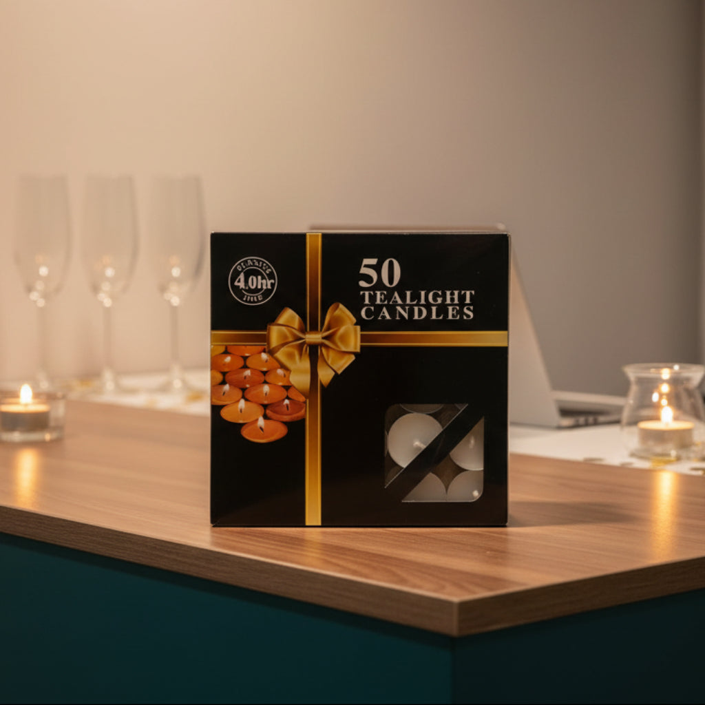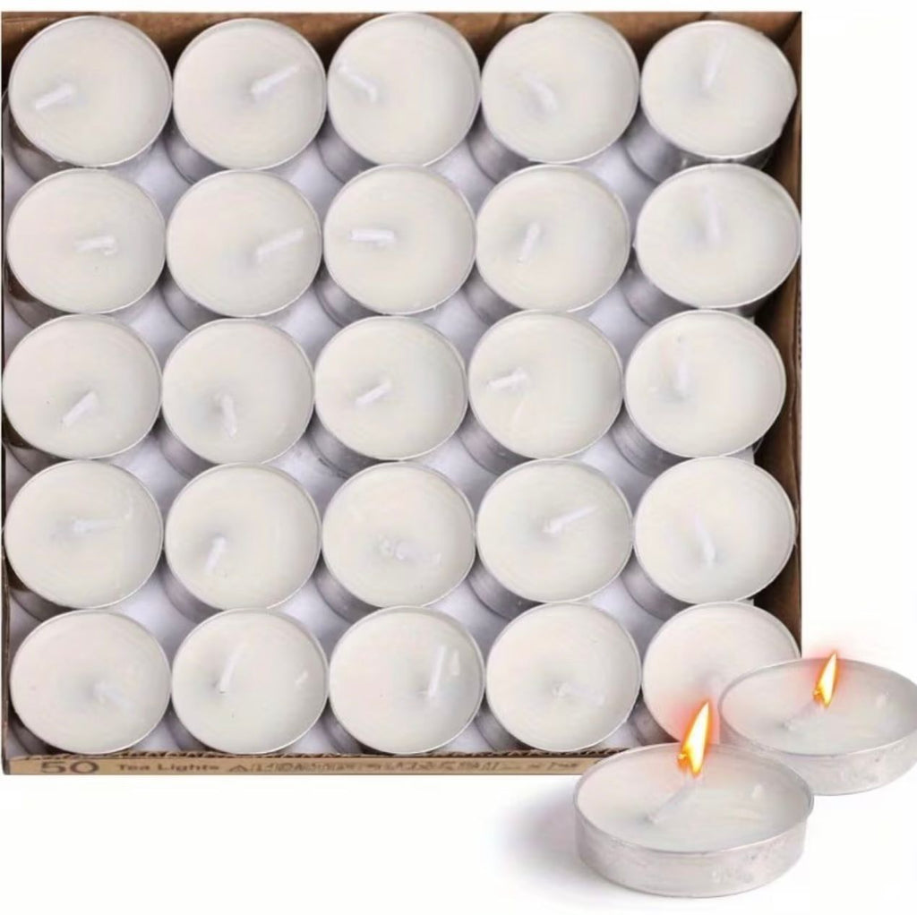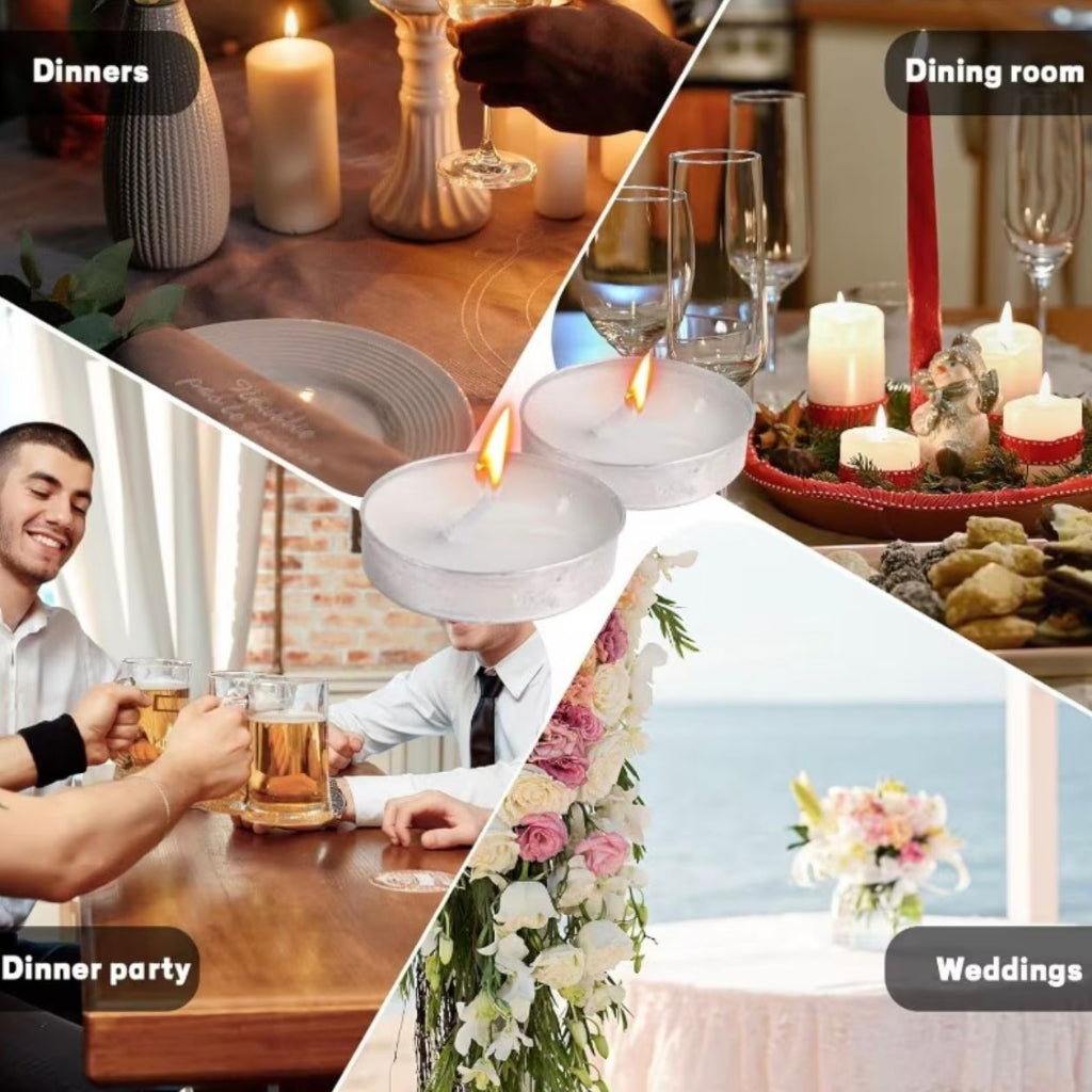 White Tea Light Candle Illuminate your special moments with this elegant white tea light candle. Measuring 3.35 cm, each candle burns for up to 4 hours, making it perfect for creating a warm, inviting atmosphere. Ideal for Valentine's Day celebrations, weddings, or family gatherings, these candles add a touch of sophistication to any occasion. Whether you're setting a romantic mood or decorating your home, these tea lights bring gentle light and charm to your space.